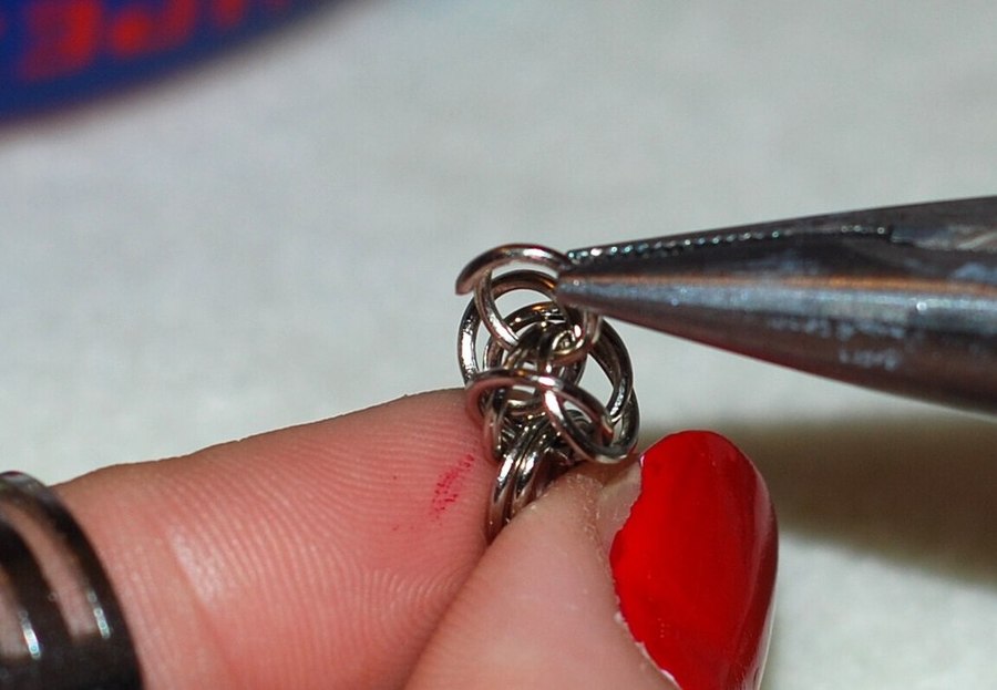 Vrchní kroužky mírně rozevřete, vezmete nový kroužek a provléknete prostředními kroužky, které jste v předchozím kroku dávali napravo a nalevo.