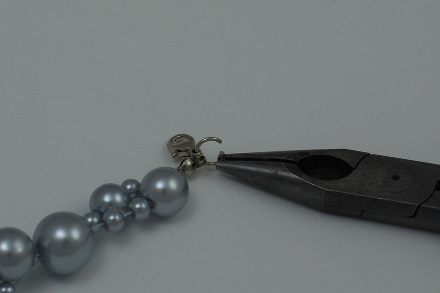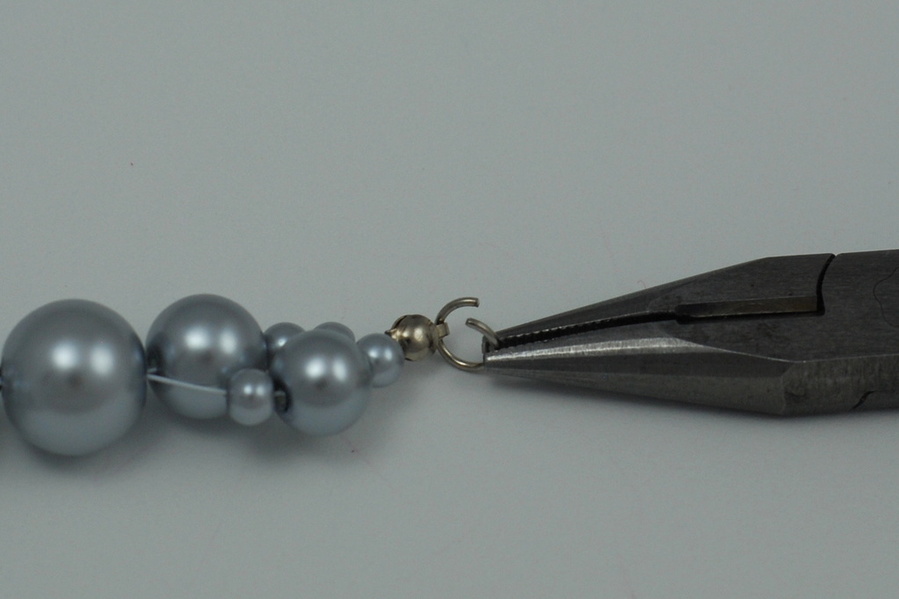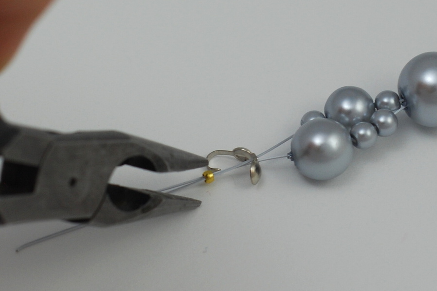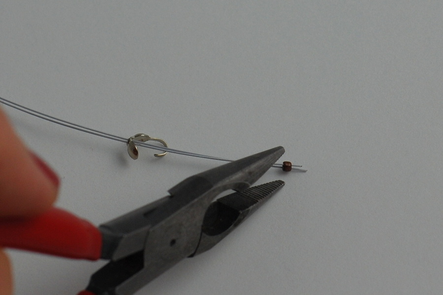 6. Za poslední perličku navléknete kalotu a zamačkávací rokajl a rokajl zmáčknete. Odstřihnete přebývající konce lanka. Kalotu zavřete přes zamačkávací rokajl.