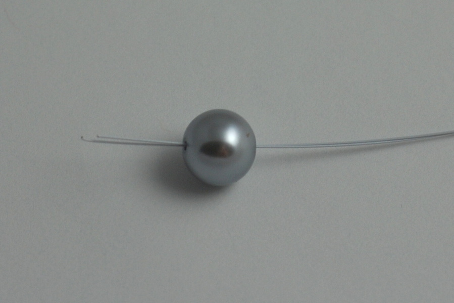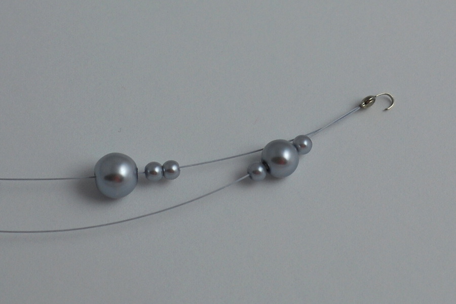 3. Na jedno lanko navléknete 2 perličky 4mm a jednu perličku 10mm, na druhé lanko navléknete perličku 4mm, perličku 8 mm a perličku 4mm.