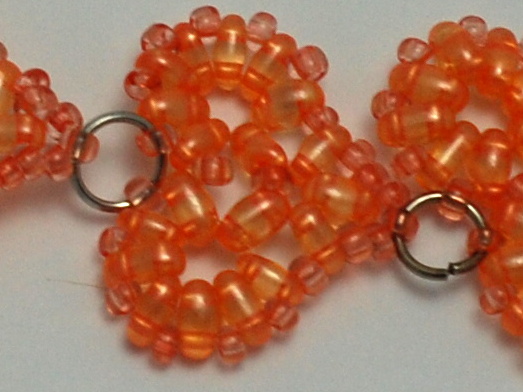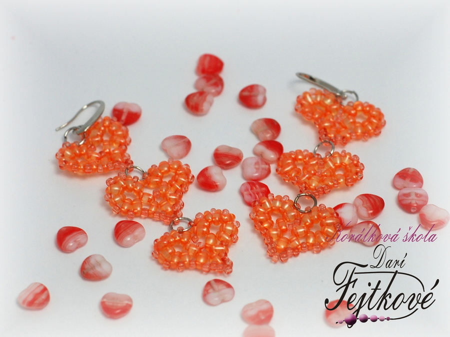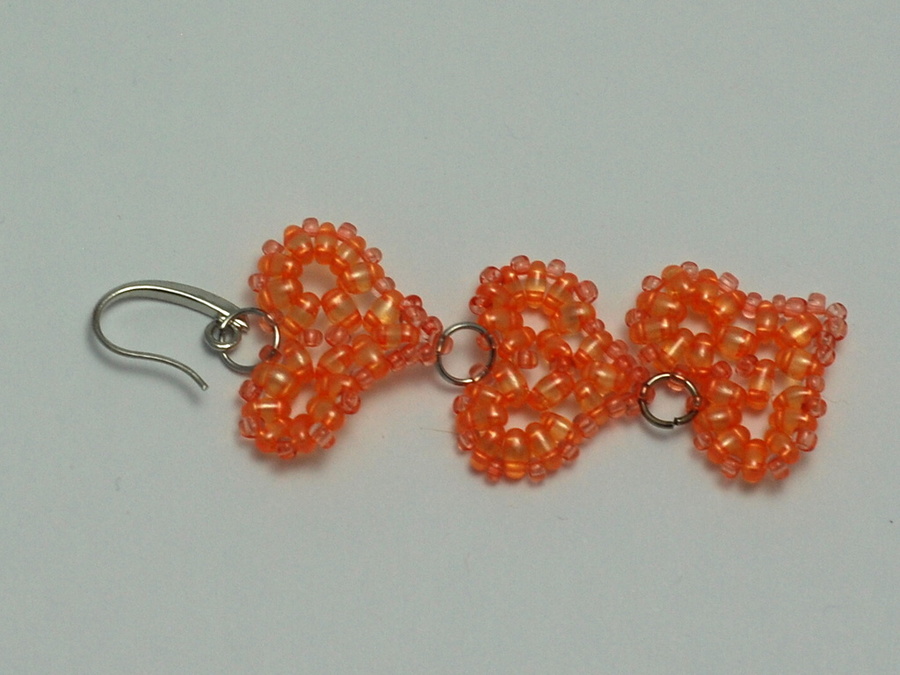 6. Ušijete si několik srdíček. Otevřete kroužek 6mm, provléknete ho horními dvěma rokajly na jednom srdíčku a jedním rokajlem ve špičce druhého srdíčka. Takto si pospojujete 3 srdíčka na náušnice.
