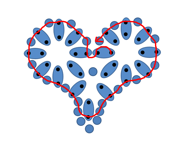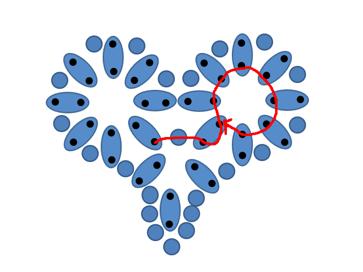 5. Celý obvod srdíčka provléknete ještě jednou a ve špičce přidáte tři rokajly. Provléknete ještě kousek obvodu srdíčka a vlasec zapošijete. Zapošijete i druhý konec vlasce.