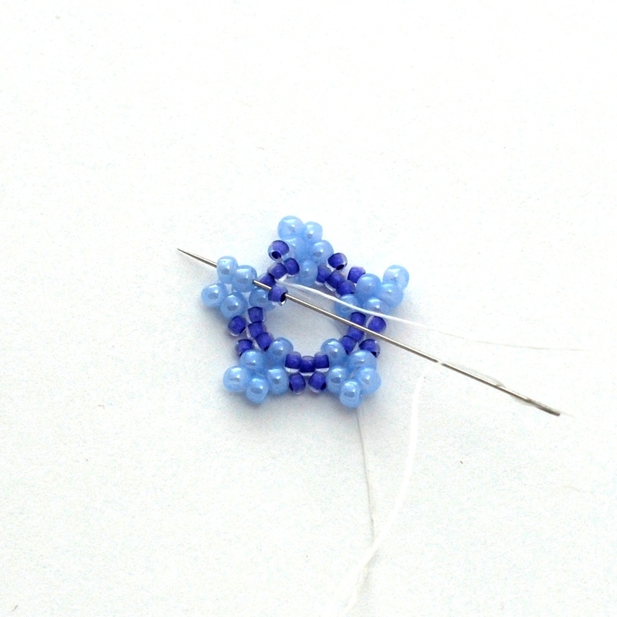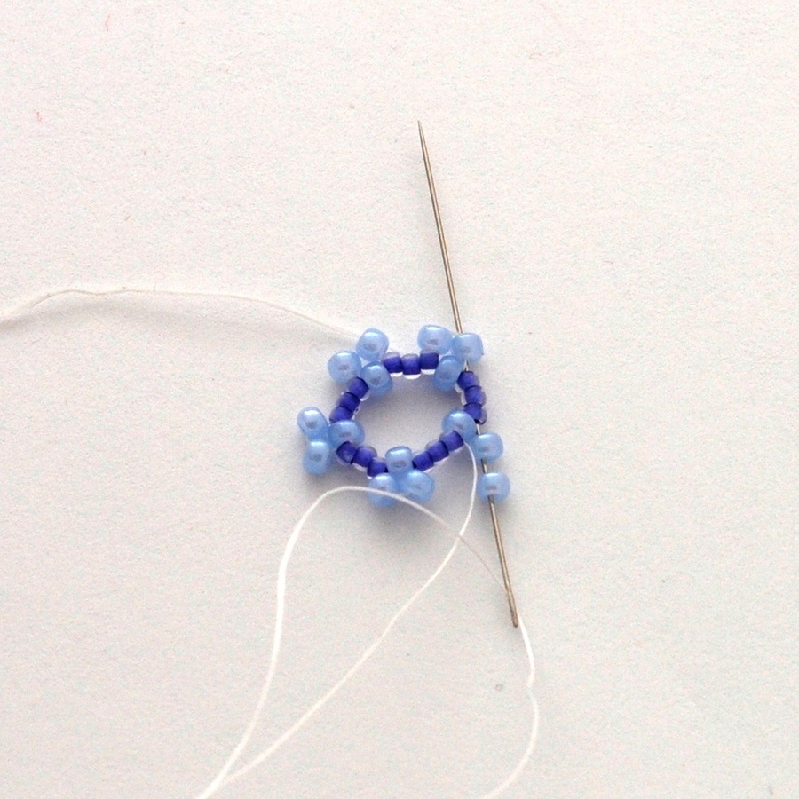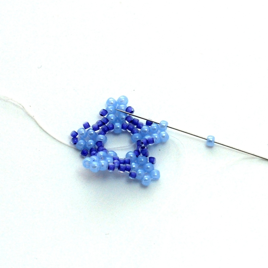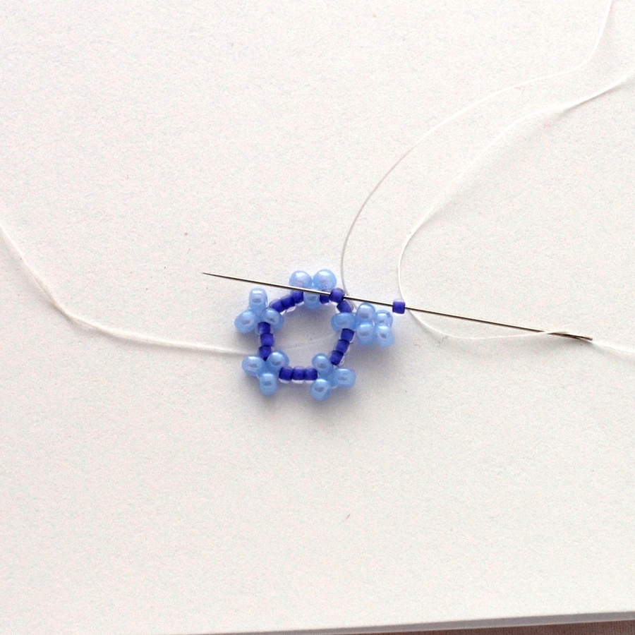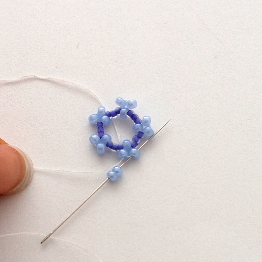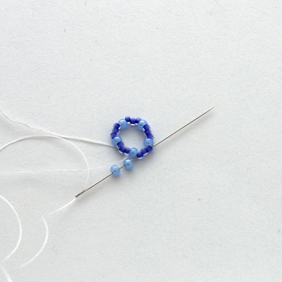 1. Ustřihneme si 1m Nyma. Navlékneme 1korálek TOHO 8, 3korálky TOHO 11, 1korálek TOHO 8, 3korálky TOHO 11, 1 korálek TOHO 8, 3korálky TOHO 11, 1korálek TOHO 8, 3korálky TOHO 11, 1korálek TOHO 8, 3korálky TOHO 11, 10cm od konce nitě svážeme korálky 2 uzlíky k sobě.
