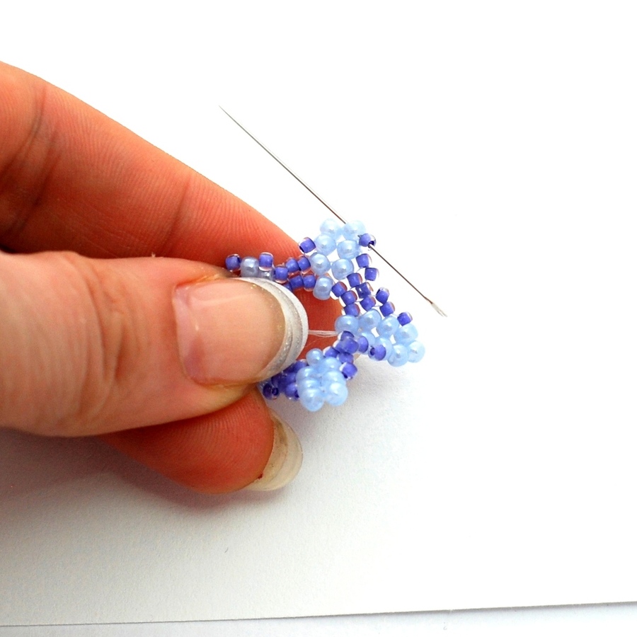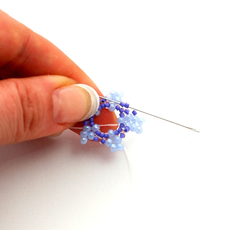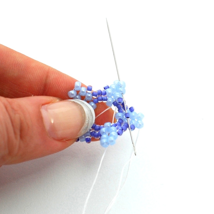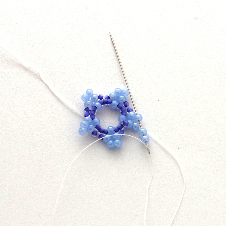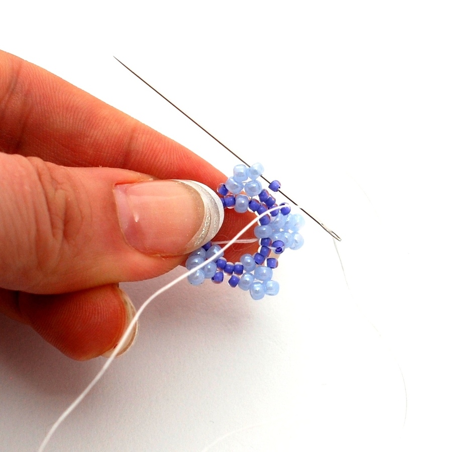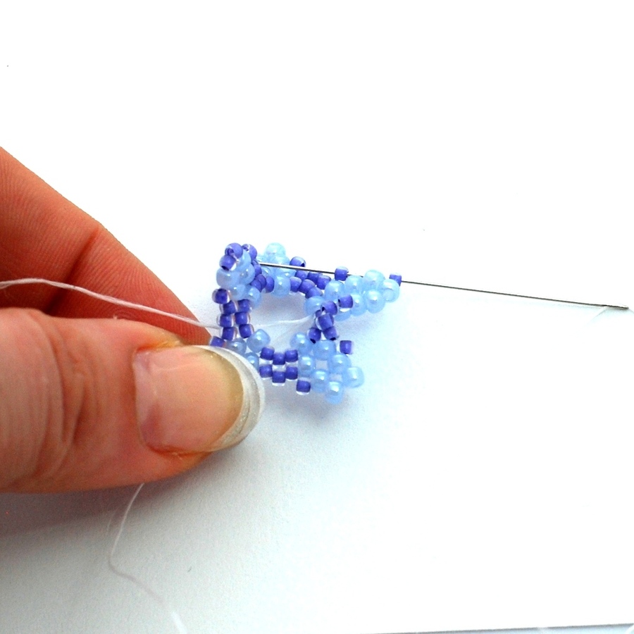 1. Ustřihneme si 1m Nyma. Navlékneme 1korálek TOHO 8, 3korálky TOHO 11, 1korálek TOHO 8, 3korálky TOHO 11, 1 korálek TOHO 8, 3korálky TOHO 11, 1korálek TOHO 8, 3korálky TOHO 11, 1korálek TOHO 8, 3korálky TOHO 11, 10cm od konce nitě svážeme korálky 2 uzlíky k sobě.