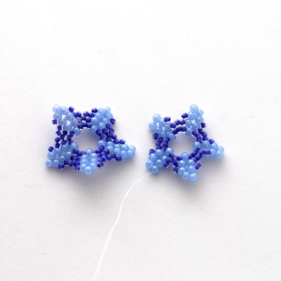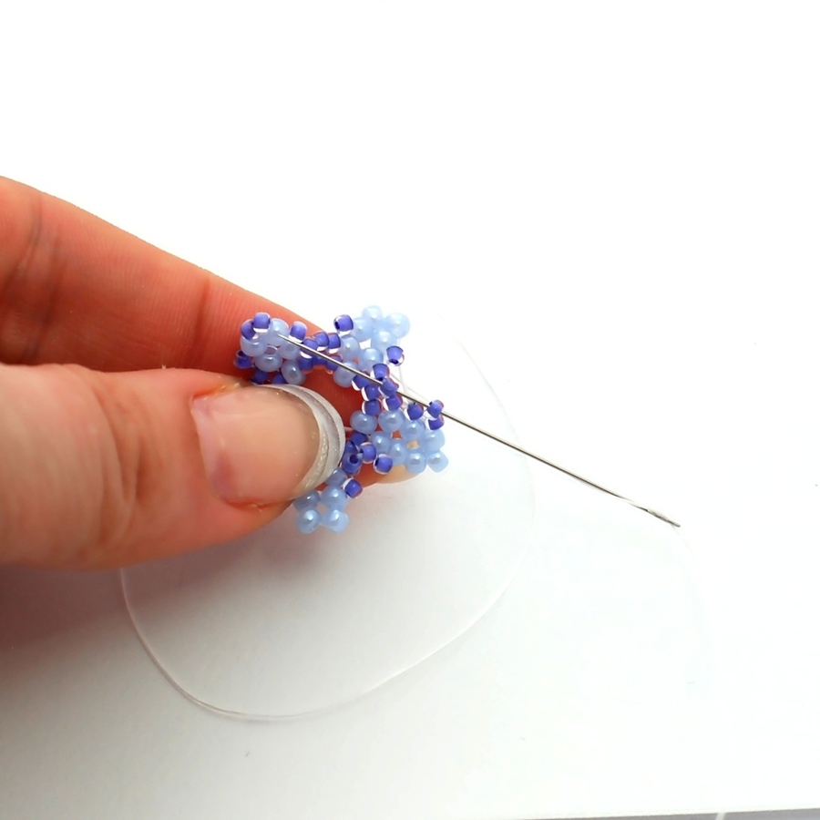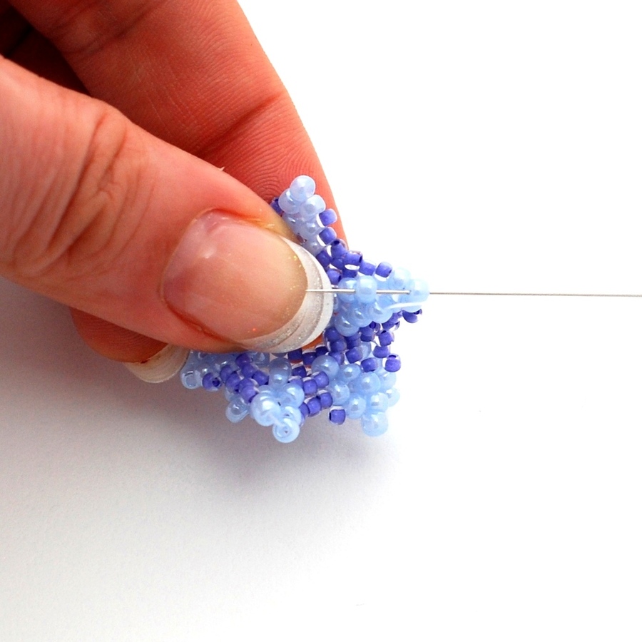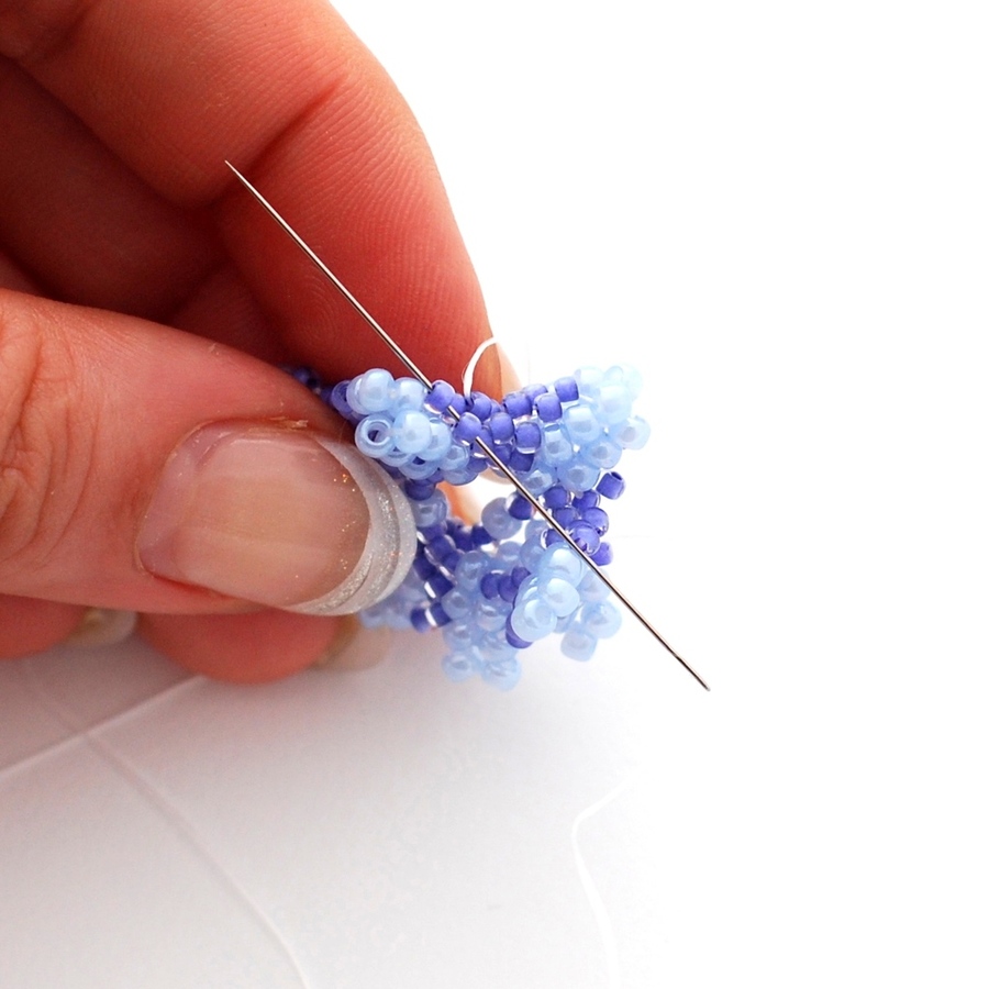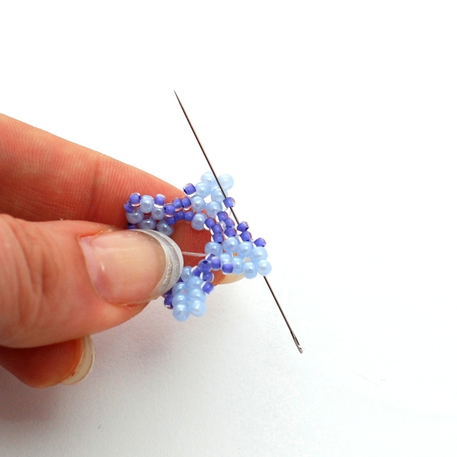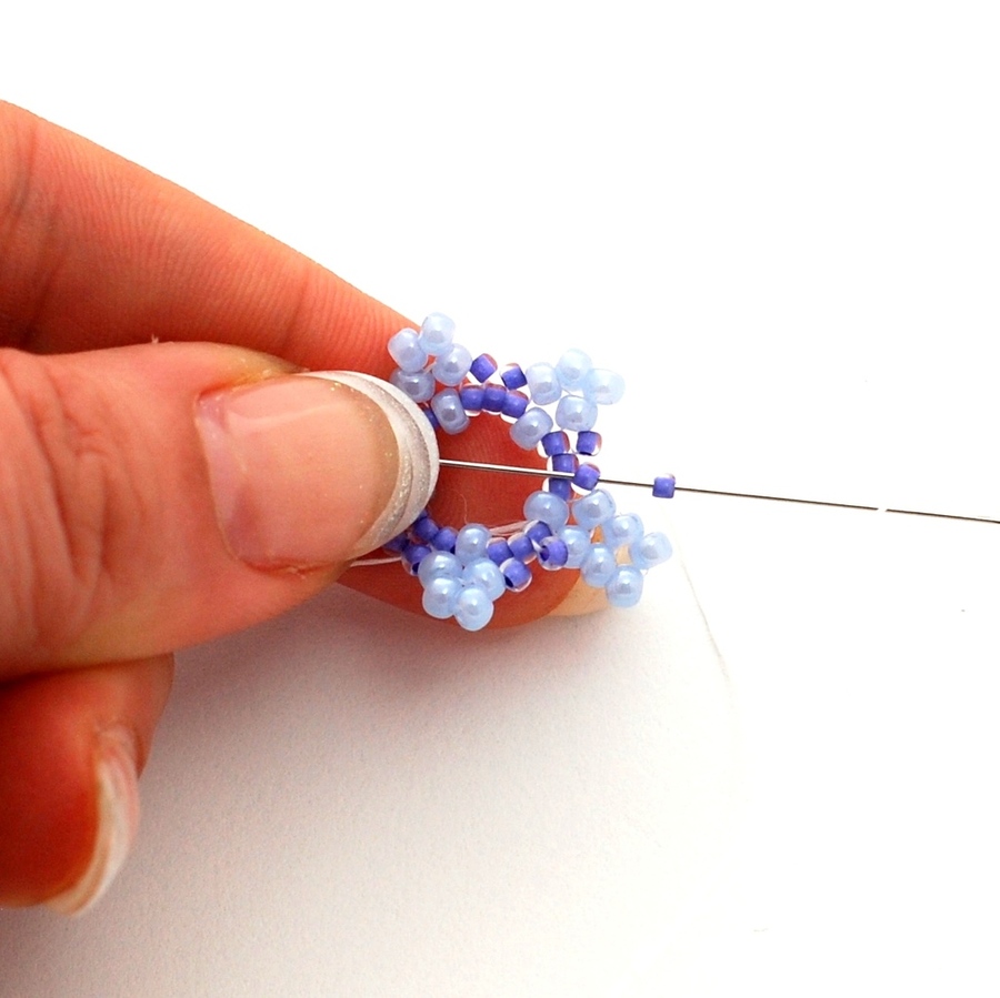 1. Ustřihneme si 1m Nyma. Navlékneme 1korálek TOHO 8, 3korálky TOHO 11, 1korálek TOHO 8, 3korálky TOHO 11, 1 korálek TOHO 8, 3korálky TOHO 11, 1korálek TOHO 8, 3korálky TOHO 11, 1korálek TOHO 8, 3korálky TOHO 11, 10cm od konce nitě svážeme korálky 2 uzlíky k sobě.